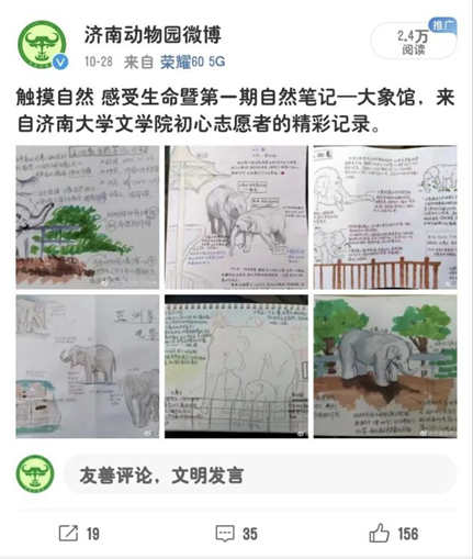 活动前期,志愿者们回顾并总结了上一期自然笔记宣传活动,针对济南动物园微博下评论中的建议,进行了活动培训,并对犀牛的品种及习性进行了详细调查与了解,为此次自然笔记记录活动做了充分的准备。活动当天,志愿者们准时到达济南动物园犀牛馆,对馆内两只白犀牛进行观察及自然笔记记录。记录过程中,志愿者们始终秉持着记录自然笔记的严谨、真实、客观、具象原则,细致观察记录白犀牛的外貌特征、行为特征及其生活环境,引发众多游客围观。活动最后,志愿者们顺利完成了自然笔记记录,上传并保留了自然笔记,进行了活动感悟的交流与总结。