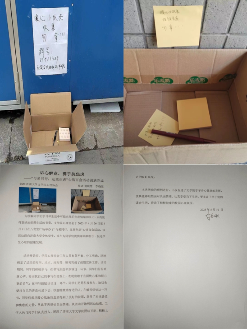 活动开始前,公司心理协会工作人员有条不紊、分工明确,迅速确定了活动的时间、地点、流程等,顺利完成了前期宣传工作。活动期间,同学们积极参与:在书写焦虑和烦恼这一环节,同学们纷纷吐露心声,将困扰自己的事写在便签上,表现出敢于直面忧心事和烦心事的勇气;在书写鼓励话语这一环节,同学们更是积极参与,迫切希望将自己的善意传递下去,以温暖激励身边的人;在解答烦恼这一环节,同学们都从暖心纸条盲盒里得到了美好的祝愿,获得了对抗恐慌和焦虑的力量,从此不再惧怕负面情绪。从活动开始到活动结束,工作人员与同学们认真投入,展现了VSport体育团结互助、积极上进的良好风采。