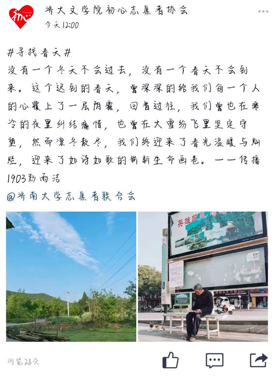 活动开始前,志愿者们组建QQ群,并给予参与者两天时间去“寻找春天”,去找寻春日里那令人悄然心动的瞬间。志愿者生活的地方不同,有生活在乡间的,他们拍下了乡间小路上的柳枝抽芽、小桥流水。有生活在喧闹的城市的,他们拍下了街边一角的报亭、公园深处的长椅。乡间和城市的春日也各有特点,不尽相同。在农村,桃花、杏花、梨花开满枝头,含苞待放,小孩子在田野里追逐打闹的场景数不胜数;在城市,虽然没有乡村的热闹,但也不乏湖光山色,湖中倒影,斜阳欲颓,山中苍柏,直立劲挺。春日里,万物生长,皆逃不过一个“荣”字。