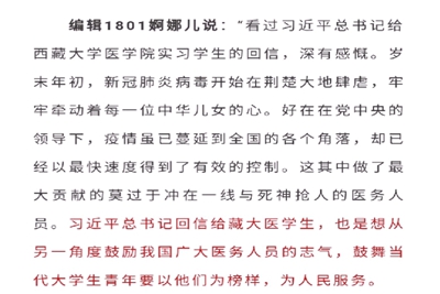 同学们一致认为,习近平总书记的回信字里行间都饱含着对广大莘莘学子的亲切教诲、殷切期望,体现了习近平总书记对西藏各族人民群众、对西藏教育事业的关心关怀,让我们深受感动、备受鼓舞。