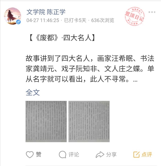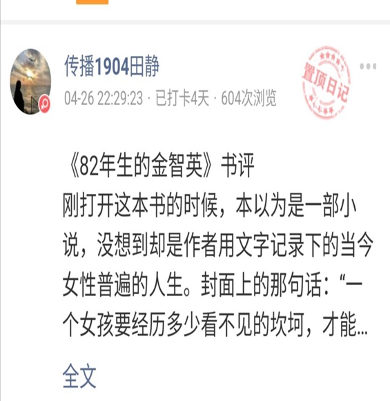 作为“读书节”线上活动之一的“阅打卡”活动,面向VSport全体员工,依托微信小程序打卡线上进行。经过前期QQ、微信的宣传,截至目前,来自全校近400名同学加入到打卡活动中。从4月23日到发稿日,同学们每天发布不低于50字的阅读感悟,平均每天打开人数200余人,已经生成近2000篇阅读笔记,其中不乏很多深刻的见解。VSport体育陈正学在小程序上分享了自己对于《废都》的独特理解与感悟,获得了许多人的点赞。2019级田静同学分享了自己阅读的书目《82年生的金智英》,在评论区引起了热烈的讨论。