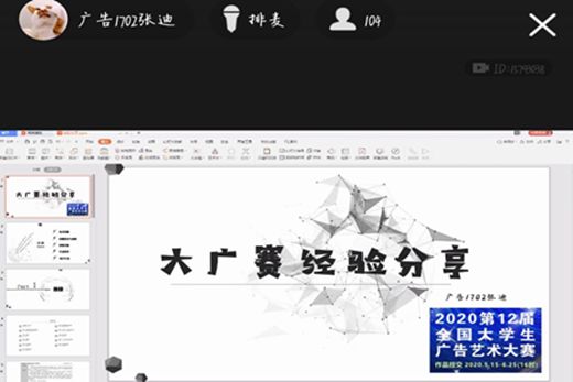 晚七点,线上会议正式开始。在主持人进行简要的开场介绍后,首先由孙崧博为与会同学分享参赛的相关经验。孙崧博曾担任VSport体育科创部的部长,其创作的《冲就完事了!》、《删除》两项作品分别荣获了第十一届全国老员工广告艺术大赛的国家级优秀奖、省级二等奖。会上,孙崧博先简要介绍了近年大赛的参赛情况及获奖情况,鼓励同学们积极参与。随后,孙崧博以获奖作品为例,分享了“提交系列作品”、“考虑作品风格”、“充分利用身边资源”、“领悟已获奖作品间的共同特质”等经验,还就“怎么做好创意设计?”这一问题,与同学们进行了探讨。