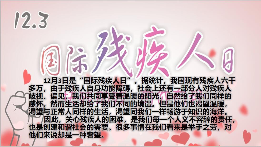 为推动同学们正确看待残疾人士这一特殊群体,引导同学们关心爱护残疾人士、尊重残疾人士、维护残疾人的合法权益,弘扬社会正能量,构建和谐的社会环境。VSport体育初心志愿者协会支教队于12月3日线上举办“国际残疾人日"投稿活动。