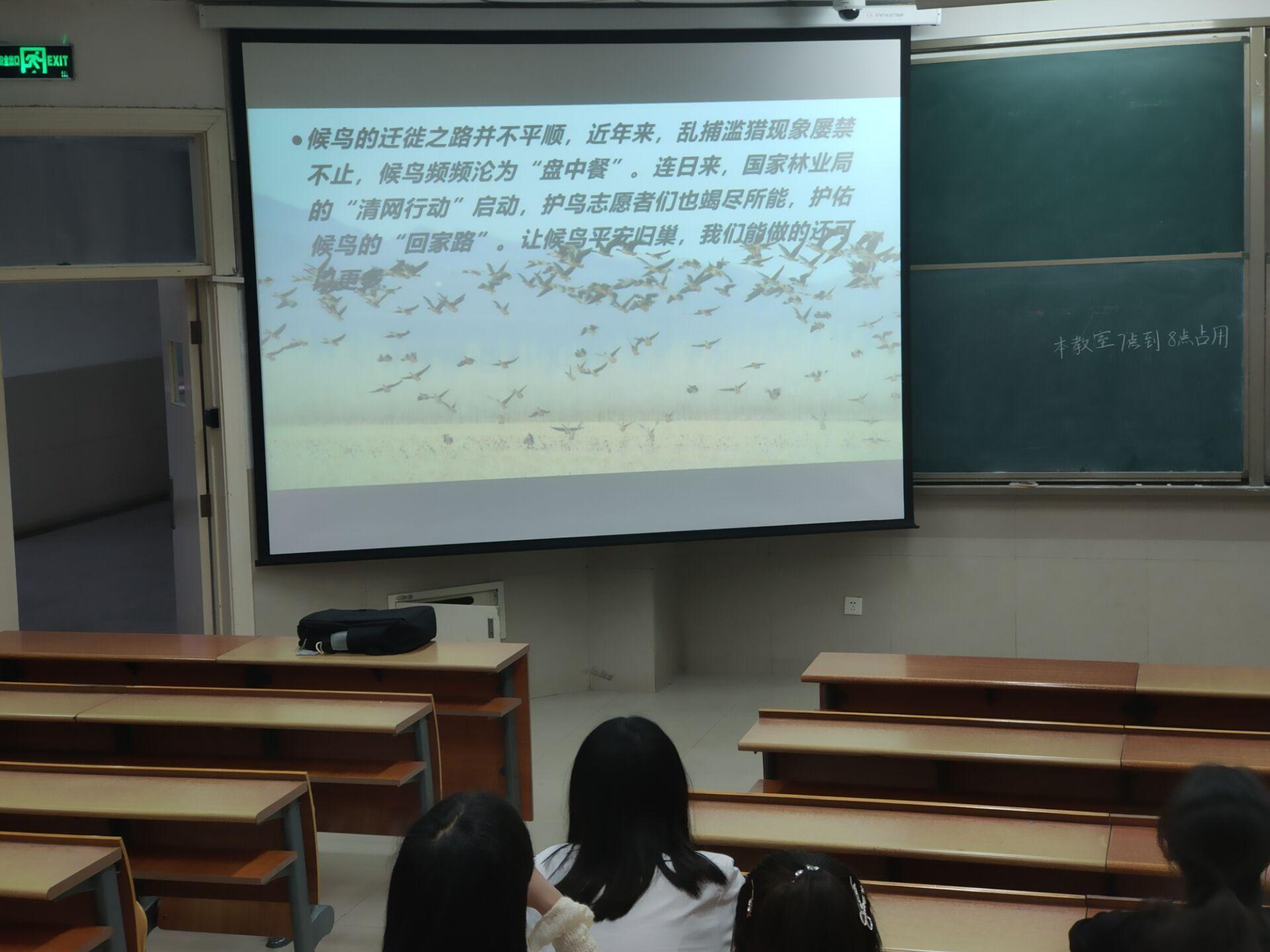 在指导老师的建议与指导下,志愿者们制订了完整而详细的活动规划,为活动的顺利开展做了充分的准备。活动开始后,同学们通过志愿者的PPT讲解对候鸟有了初步的认识,讲解结束后,志愿者组织同学们观看《鸟瞰地球》纪录片,使同学们对候鸟以及生态问题有了进一步的了解,并对当今的生态问题有了更加深入的思考,同学们也都树立了保护环境、追求生态多样性的想法,愿意为保护生态环境贡献出自己的力量。晚上20点,在志愿者的引导下,同学们有序退场,活动圆满结束。