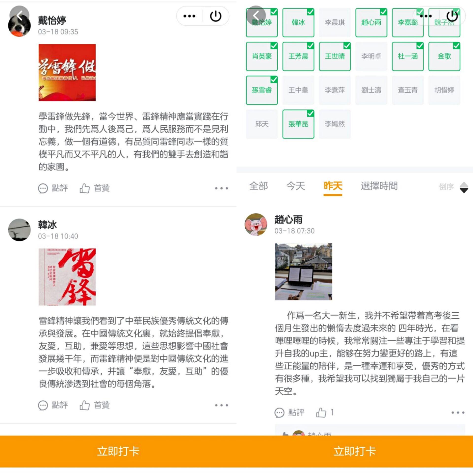 活动准备期间,相关负责人明确活动形式为小程序线上打卡,为期七天,以爱国主义、树立目标、社会服务、班级荣誉、团结同学、寝室关系、红色足迹、感恩父母、时代楷模等角度出发。志愿者根据自身情况设立打卡计划,每天简单记录完成情况并附上照片,结束后总结自己的做法并思考活动带来的意义。雷锋同志曾在日记中这样写道:“我甘心愿意做这样的傻子”,他向上的人生姿态实践着勤勉学习,乐观有为,他向善的价值追求阐述着爱国、奉献、无私、正义。参与者们积极学习雷锋精神、续写雷锋故事,本次“续写雷锋日记”打卡活动圆满结束。