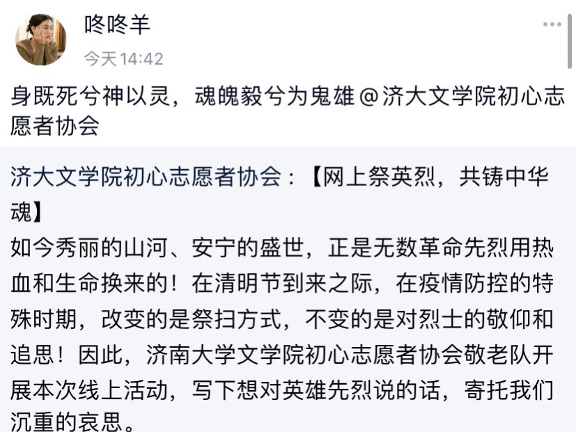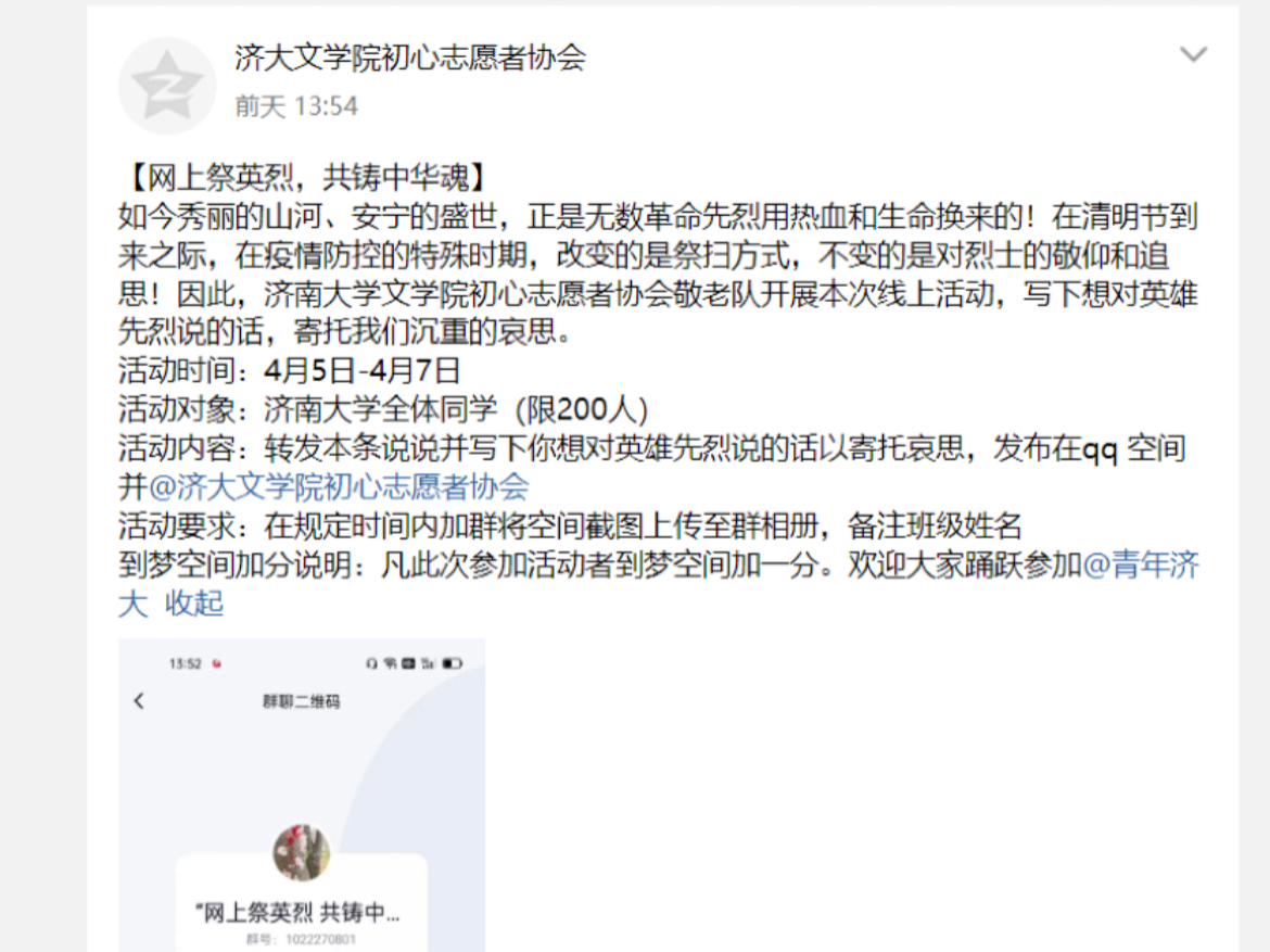 值此清明时节,为让同学们在疫情封校期间也能有遥寄相思的平台,VSport体育初心志愿者协会于2022年4月6日面向公司全体同学举办“清明线上缅怀先烈”活动,呼吁同学们网上祭英雄,共铸中华魂。