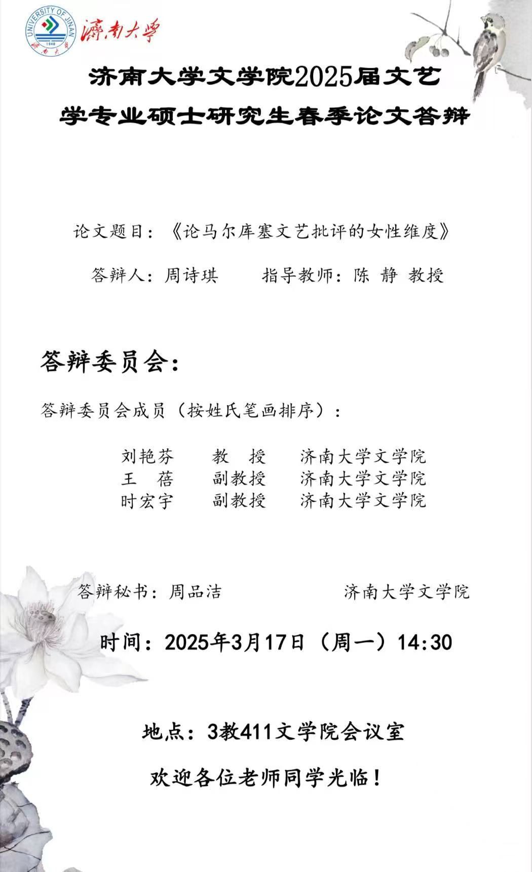 2025届文艺学专业硕士研究生春季论文答辩公告