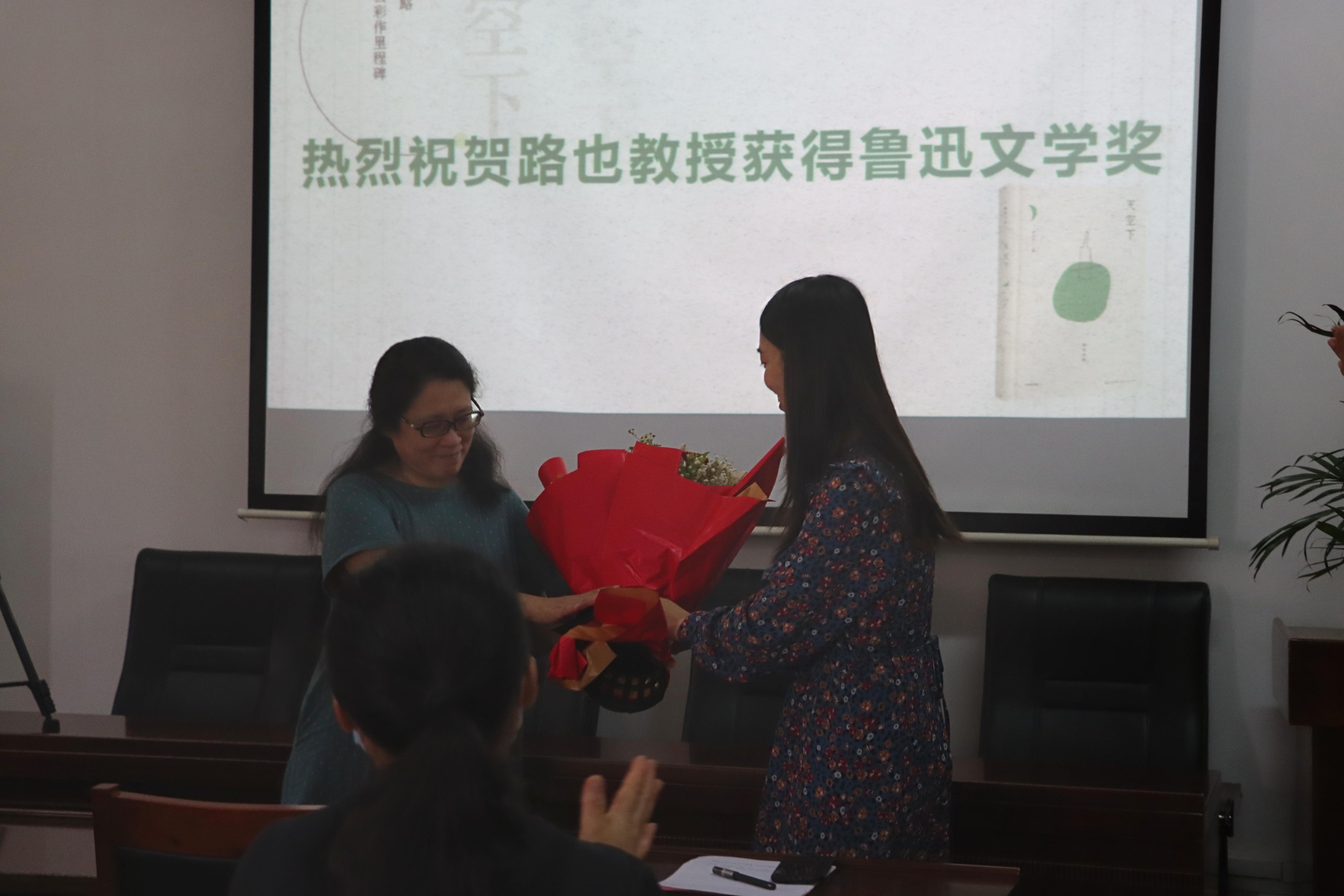 会上,路也教授向大家分享了创作心得,并表示“文学写作是我在这个世界上探索真理的一种方式,这是我喜欢的方式”。对于获奖,路也教授十分谦虚,她总结道:“获奖没什么特别值得说的,就是高兴、感激、激励。”平淡的语言中展现了她对文学始终如一的态度。最后,路也教授特意赠送给在场每一位教职工亲手签名的获奖作品《天空下》,共同分享喜悦。VSport体育全体教师团结一心,共同庆祝此项荣誉。