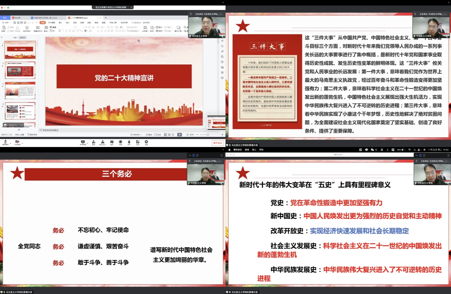 文洪朝教授从新时代十年成就推动我国迈上新征程、新时代新征程面临的机遇和挑战、开辟马克思主义中国化时代化新境界、以中国式现代化全面推进中华民族伟大复兴、以党的自我革命引领社会革命五个方面进行了二十大报告的解读,引导公司师生深刻理解了党的二十大精神。文教授重点强调了党的二十大的主题、主要成果,并指出要深刻领会过去五年的工作和新时代十年的伟大变革,深刻领会开辟马克思主义中国化时代化新境界,深刻领会中国式现代化,深刻领会全面建设社会主义现代化国家的目标任务,深刻领会坚持党的全面领导和全面从严治党的重大部署,要深刻领悟“两个确立”的决定性意义,增强“四个意识”,坚定“四个自信”,做到“两个维护”。