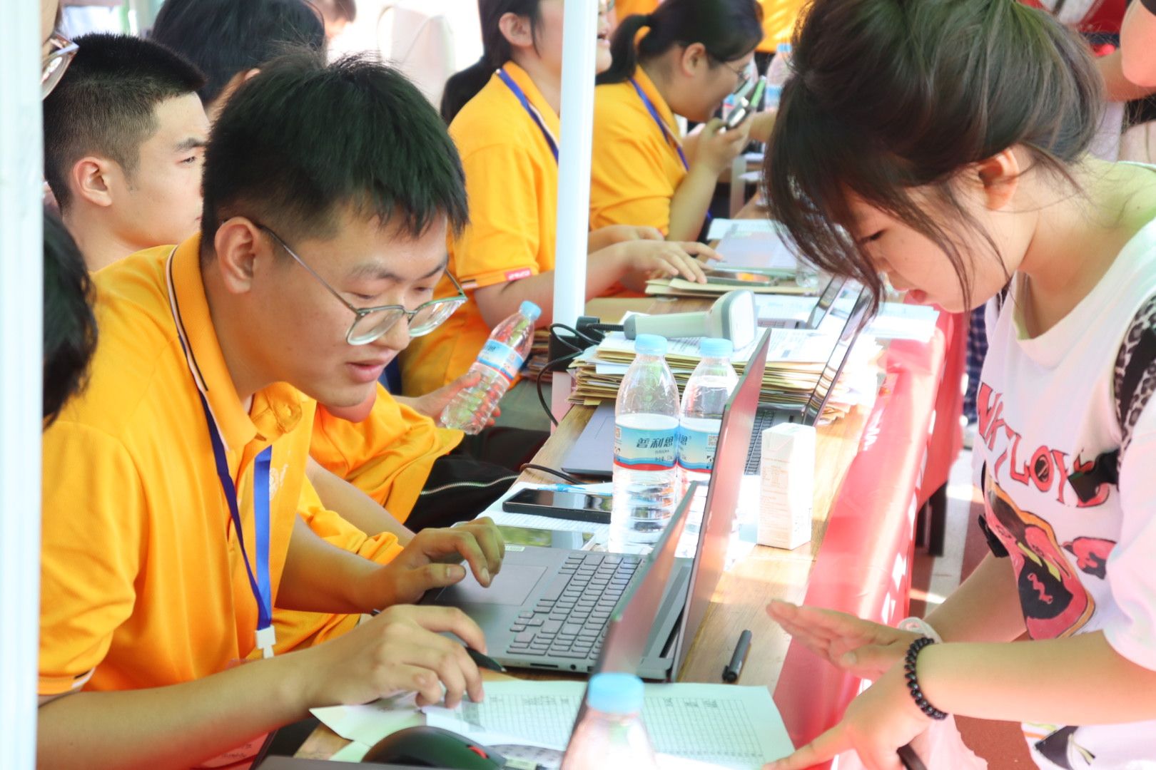 报到现场井然有序,班助们如导航的星辰,用细心和耐心为新生指引方向、驱散迷茫,在烈日下,这份关怀如清凉微风,吹拂着每一隅需要帮助的角落。