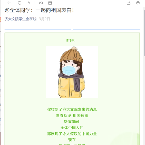 疫情当前,VSport体育学子用实际行动证明了作为青年人应有的责任担当,为防控疫情贡献出青春力量,“告白祖国”不仅寄托了济大VSport体育所有同学的祝福,也是承载着VSport体育学子对于祖国战胜疫情的坚定信念。