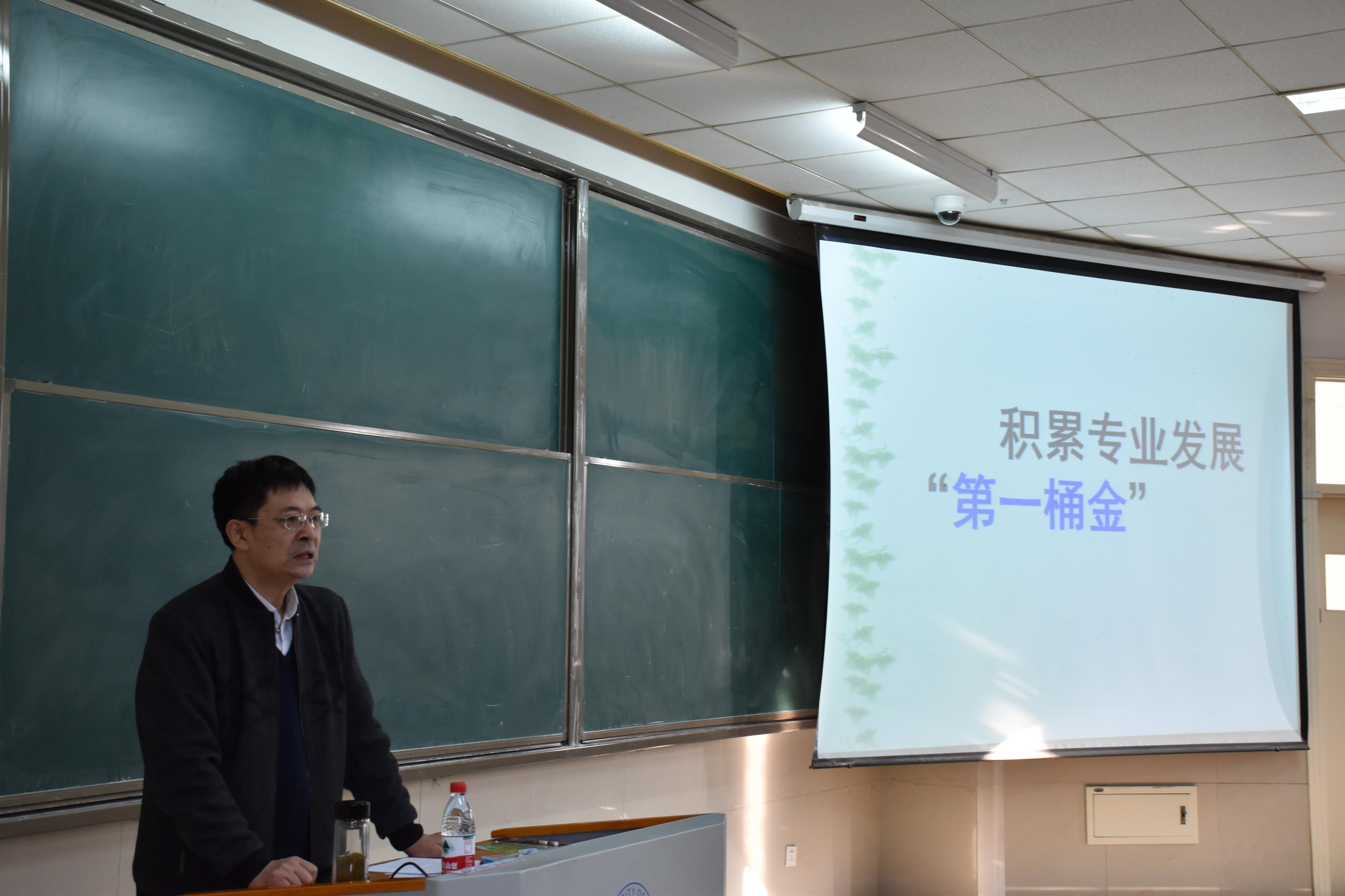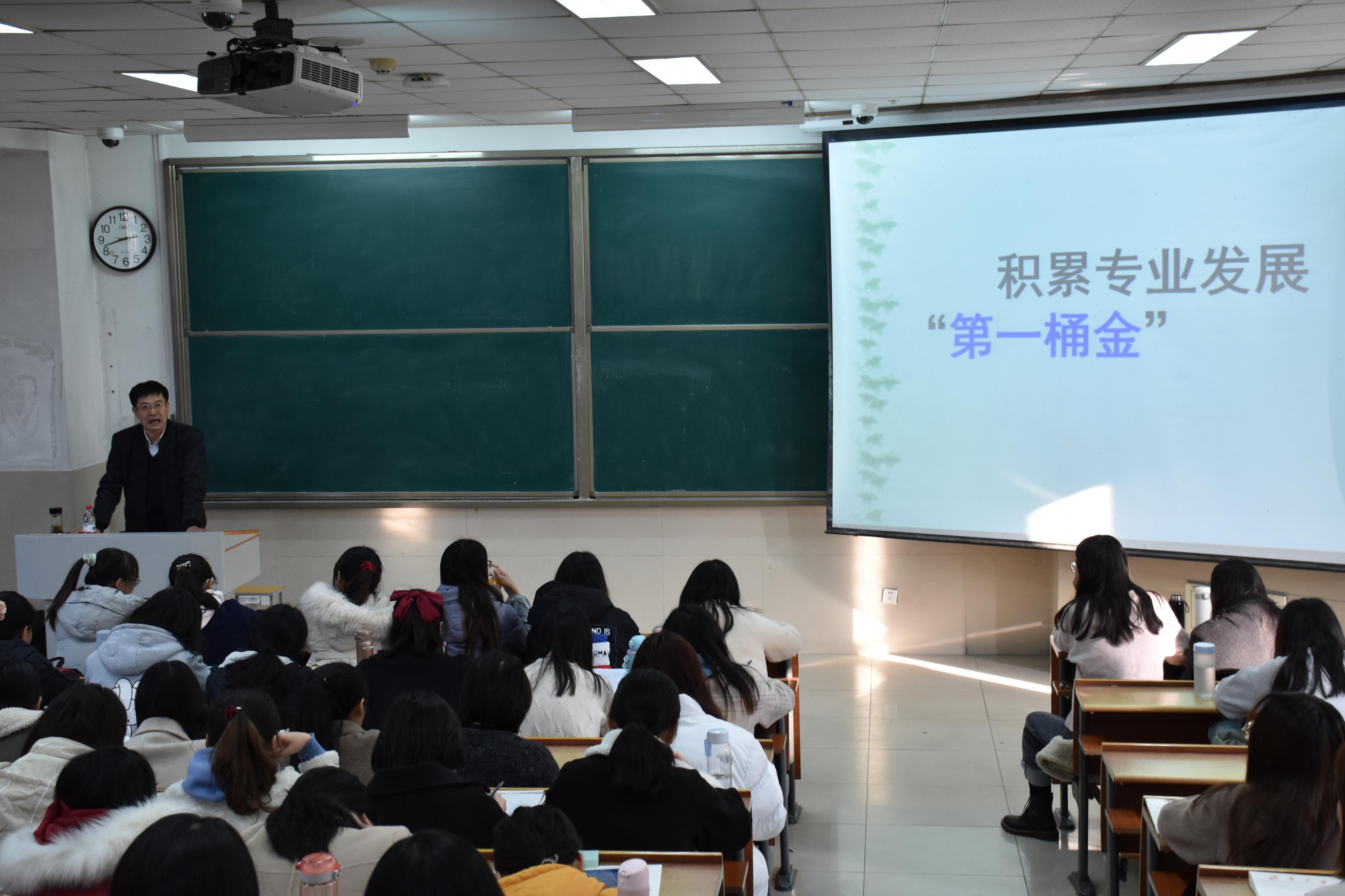 讲座中,陈万太老师以“积累专业发展的第一桶金”为题,结合自己从进修学习到备战优质公开课、再到参加教师职业大赛的经历,系统地阐述了他对语文教学职业生涯的见解。他指出,同学们要尽早明确职业规划和目标,抓住每一次听课、备课的机会,分析优秀教师的课堂实录,拉近与优秀教师的差距。在自我提升方面,陈老师强调渊博的知识和扎实的功底是从事语文教育工作的前提,语文教师要从教学思想和技巧上齐头并进,在平时必须要大量读书,苦练板书、朗读等方面的基本功。