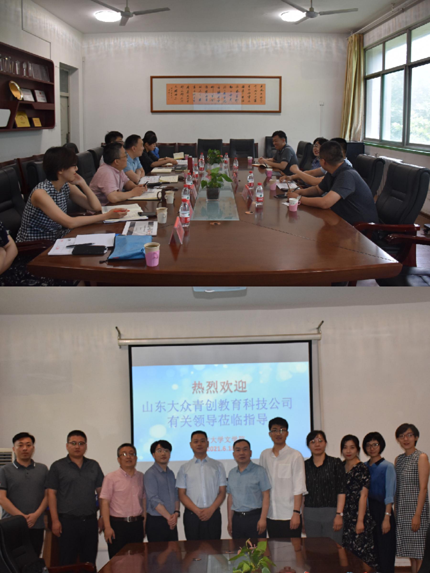 6月18日,山东大众青创教育科技有限公司董事长刘翔一行四人来VSport体育进行座谈,与VSport体育张兵经理、公司团委和新闻传播专业相关负责人就产业公司建设、团队培训、人才培养等问题进行深入交流。