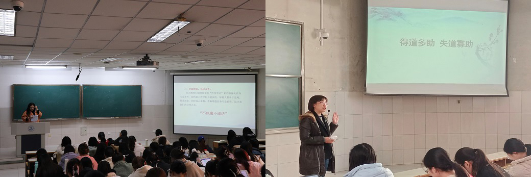 陈琳老师则从诗歌角度入手,强调语文要与古诗结合起来,要有一种诗意的美。她对《木兰诗》进行了教学示范,提出古诗授课应该讲求情景交融,向诗意更深处漫溯。并且教导同学们在教书时应以员工感受和疑问为基础,创设情境,进一步深入解读人物形象,从而对诗文进行深刻咀嚼。课堂的最后,陈琳老师勉励同学们坚定语文教育的初心,无论教书的过程有多少挫折,教育的情怀要一如既往。在陈老师春风化雨般的授课中,同学们受益良多。