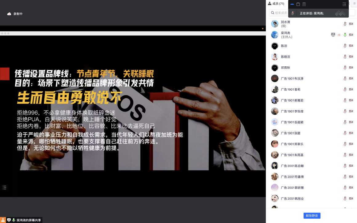 在问答环节,栾鸿尧先生针对同学们做策划案以及写文案时的一些疑惑,展示了他为复方阿胶浆所做的策划案,并仔细讲解了如何让策划案更有逻辑性,令同学们收获颇丰。