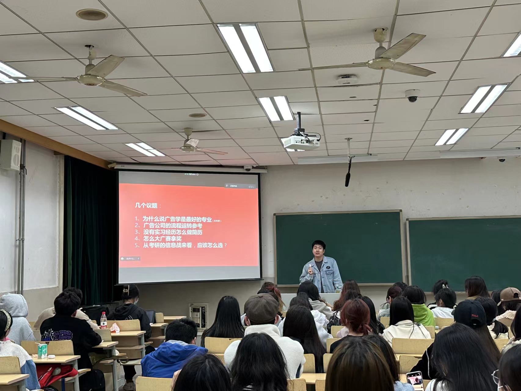 2023年4月20日晚,公司邀请WMY创意热店创意总监、BIGDOOR大门互动策略顾问李鑫先生面向广告学专业师生进行了一场创意分享会。本次分享会围绕广告学专业的优势、广告公司的运作流程、实习简历的设计制作、大广赛参赛经验、考研与就业的选择等问题展开。广告学专业2021级全体员工、广告学专业负责人陈晓洁、广告学专业实习负责人刘水清积极参与并认真聆听了本次分享会。