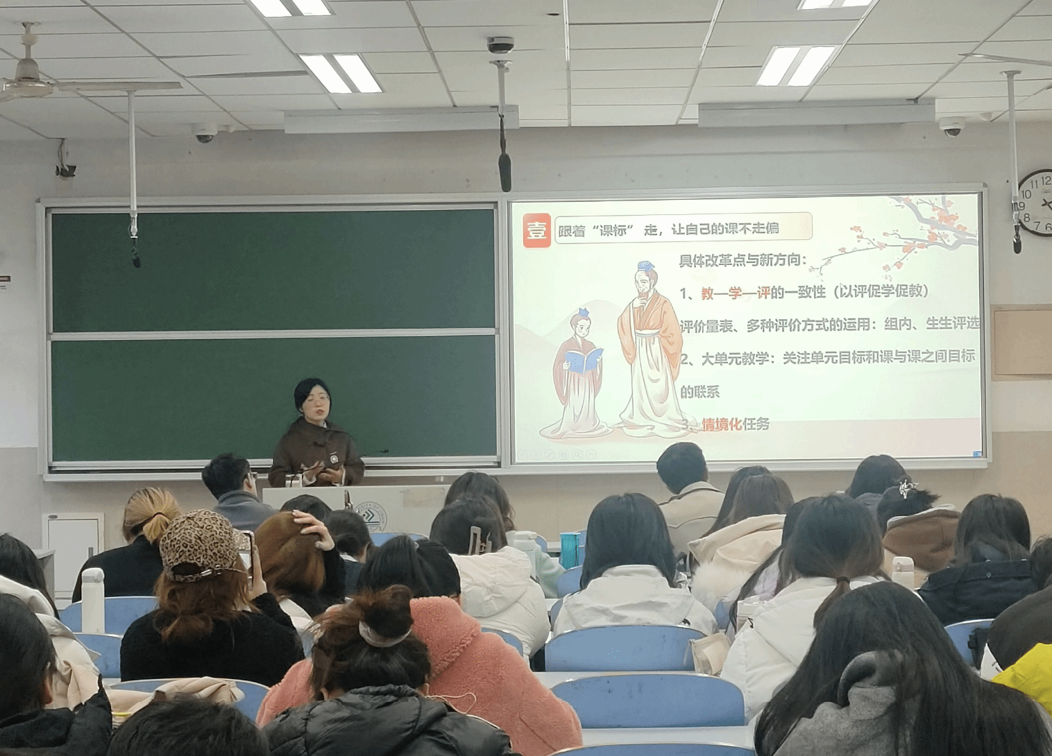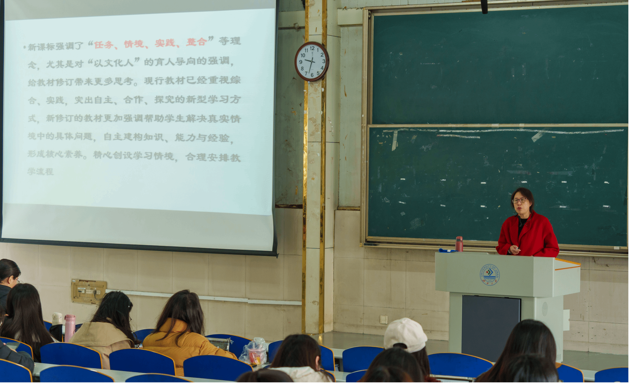 11月18日下午、11月22日下午,分别邀请第十二届山东省师范类高校员工从业技能大赛高中组一等奖获得者刘骏成和初中组一等奖获得者王文泉进行了备赛经验分享。在教育见习期间,员工自行结合成小组,进行了教学展示,见习指导老师从教姿教态、教学设计、文本分析、作业布置、板书设计等方面进行了点评。