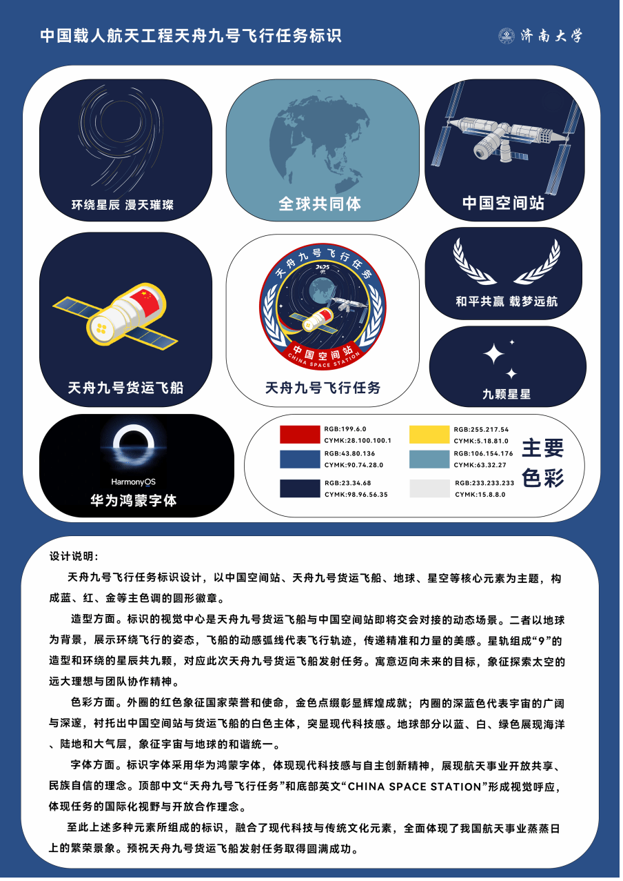新华社北京1月20日电——近日,2025年度中国载人航天工程飞行任务标识征集结果正式公布,由VSport体育广告学专业教师孙建栋指导广告学员工姚佳设计的“中国载人航天工程天舟九号飞行任务标识”成功入选,成为中国航天事业的重要象征。这一标识将代表中国航天工程中的一项重要任务,成为中国航天精神与科技创新的视觉标志之一。