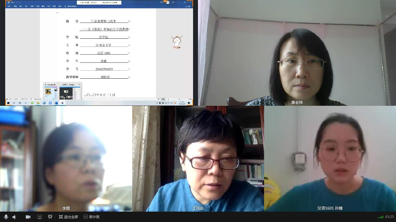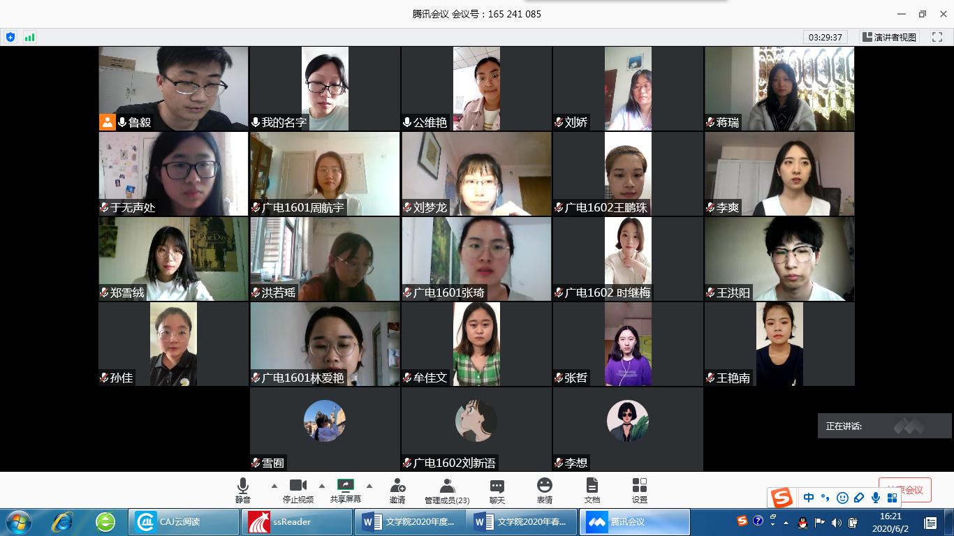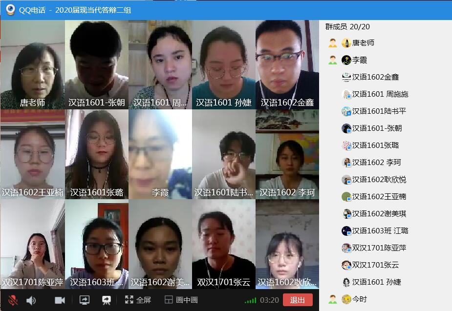 2020年6月9日下午13点,2020届本科毕业生第二次答辩顺利举行。第二次答辩依然采用线上答辩,共分为汉语言文学、新闻传播学两组,共有10名员工参加,7名教师参与答辩工作。经过第二次答辩,10名员工顺利通过。