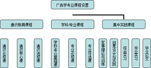 广告学、传播学、新闻学、中外广告史、电脑图文设计、创意写作、广告创意与策划、广告文案写作、广告摄影、公共关系、中国审美文化史、广播电视广告、市场营销学、CI原理与实务、网络广告艺术策划。