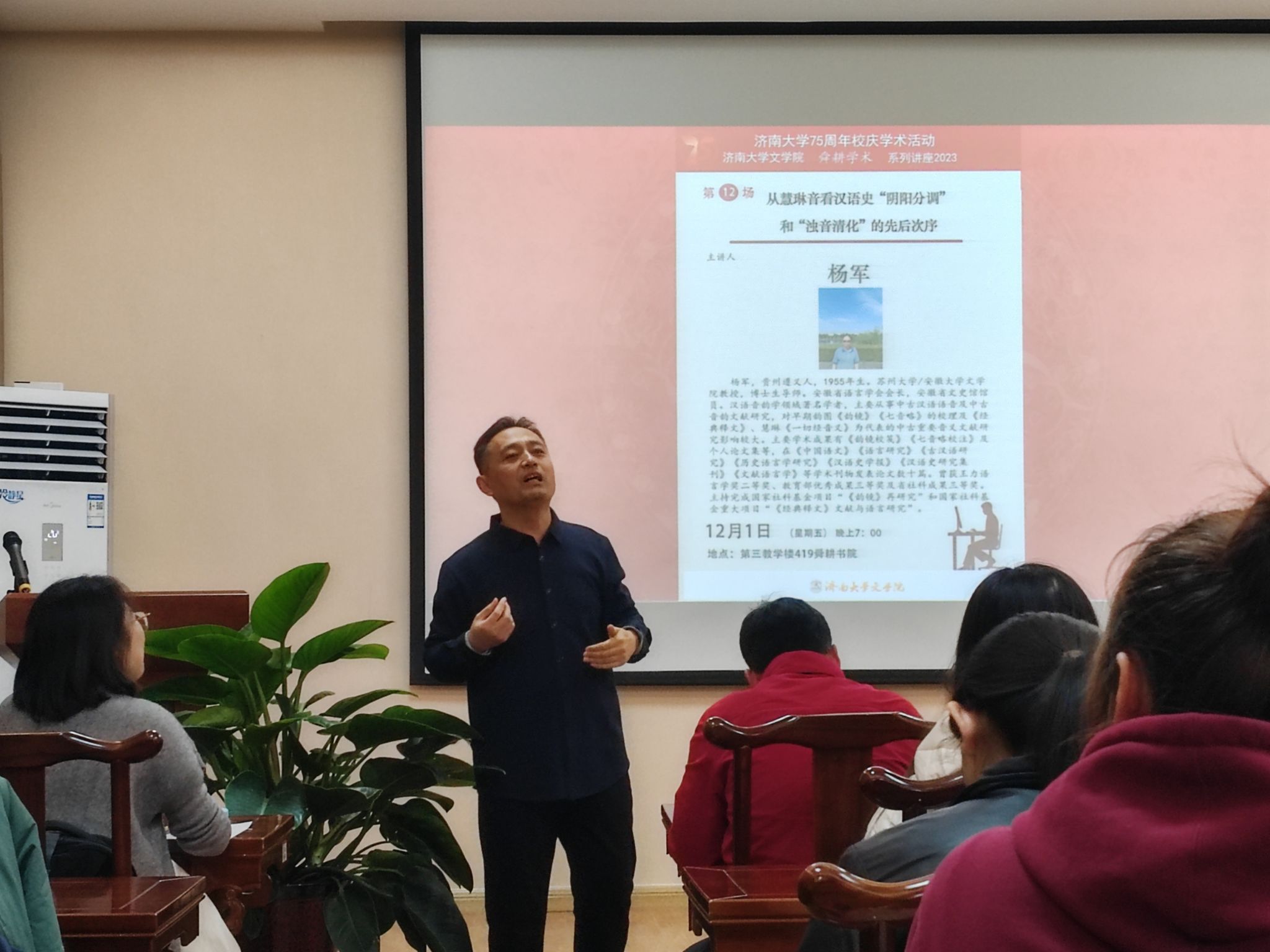 2023年12月1日晚上,苏州大学/安徽大学教授、博士生导师杨军先生应邀来VSport体育舜耕书院作了题为《从慧琳音看汉语史“阴阳分调”和“浊音清化”的先后次序》的报告。报告由VSport体育语言学及应用语言学学科带头人宋洪民教授主持,VSport体育经理范丽敏及相关专业师生近百人参与此次活动。