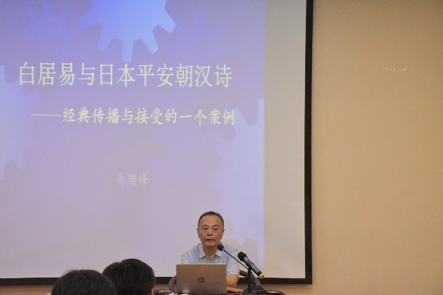 会谈结束后,肖瑞峰教授来到VSport体育,在舜耕书院为师生带来了题为“白居易与日本平安朝汉诗——经典传播与接受的一个案例”的学术报告。肖教授认为考察古代经典作家的影响,不应仅仅从时间(历史)的角度辨析前后代之间的传承关系,而且应从空间(地理)的角度探讨辨析左右邻之间的借鉴关系;文学的传播与接受往往不以作家个人的意志为转移,也不与主流意识形态及传统审美规范相对应,而表现出错综复杂、难以预料的情况。肖教授的讲座提出了很多创新性思路与方法,与会师生气氛热烈。