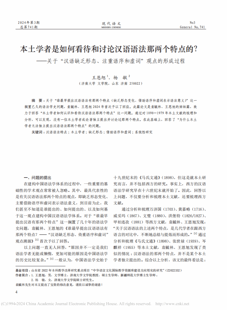 公司王恩旭副教授与硕士研究生杨敏所撰写的论文《本土学者是如何看待和讨论汉语语法那两个特点的?——关于“汉语缺乏形态、注重语序和虚词”观点的形成过程》于《现代语文》2024年第3期发表。论文为山东省 2022 年本科教学改革研究重点项目“中华语言文化国际教学资源库建设及应用实践研究”(Z2022332)的阶段性成果。
