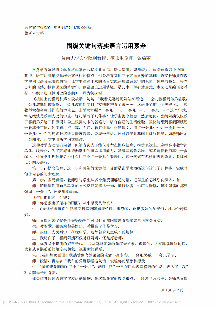 公司谷瑞丽副教授的文章《围绕关键句落实语言运用素养》于2024年3月27日在《语言文字报》发表。