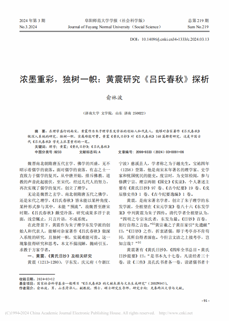 公司俞林波副教授的论文《浓墨重彩,独树一帜:黄震研究<吕氏春秋>探析》于《阜阳师范大学学报(社会科学版)》2024年第3期发表。论文为作者所主持的国家社会科学基金一般项目“《吕氏春秋》的文献来源与文本生成研究”(20BZW045)的阶段性成果。