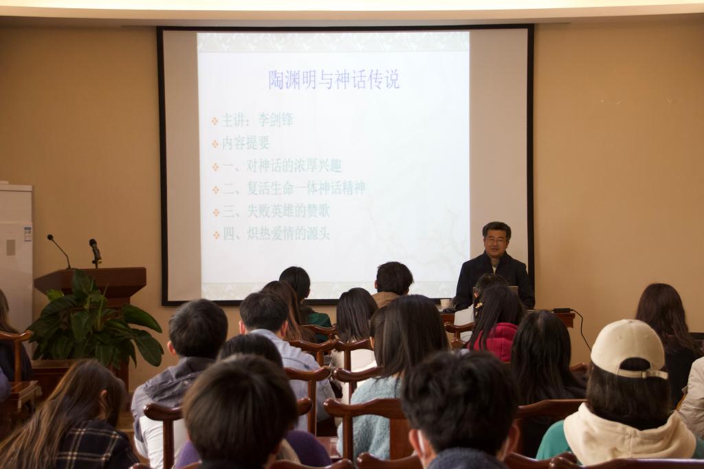 李剑锋教授首先指出陶渊明的诗文创作与神话传说有密切的关系,主要来自《山海经》和《穆天子传》,然后从生命一体神话精神的复活、失败英雄的赞歌、炽热爱情的源头三个方面,分别阐述了陶渊明的有关诗文与神话传说的精神联系。李教授表示陶渊明具有摆脱实用和理性束缚的审美态度,其诗歌努力恢复物我之间的情感交流,从感物、比物到拟人,其中物我融合的态度表现出审美的觉醒,达到了一种自觉的境界,可说是对物我一体神话精神的诗性继承。李教授指出陶渊明多次在诗文中赞颂夸父、精卫、刑天等神话人物,这几位人物都是失败的神话英雄,表明其摆脱了“成王败寇”的传统价值取向,折射出他借助原始神话的抗争精神以摆脱自己建功立业理想失败的心路历程。陶渊明《闲情赋》之“十愿”包含“敬”和“爱”两方面的炽热爱情,李教授认为,这种爱情不存在于传统的儒家思想和道家思想中,而应当从神话传说中探寻它的情感渊源。讲座接近尾声,李教授还总结了陶渊明和神话的其他关系:将神话传说中的幸福世界转换为桃源;从神话传说中汲取乐生拒死的精神力量。