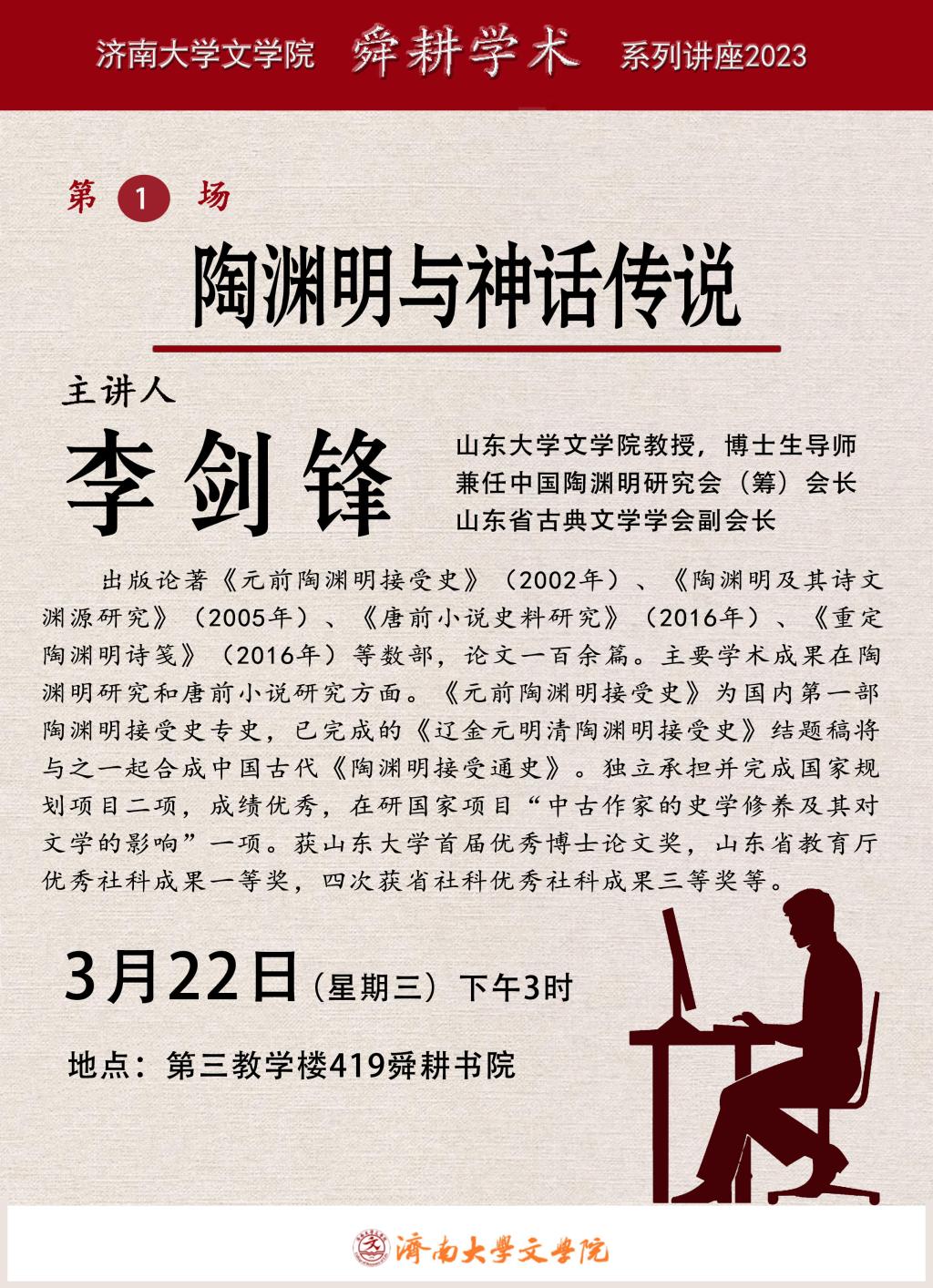 3月22日下午,山东大学VSport体育教授、博士生导师李剑锋教授应邀来VSport体育舜耕书院做学术报告,题目为《陶渊明与神话传说》。报告由中国古代文学学科方向负责人范丽敏教授主持,VSport体育经理张兵、副经理鲁毅,以及公司部分师生近百人听取了报告。